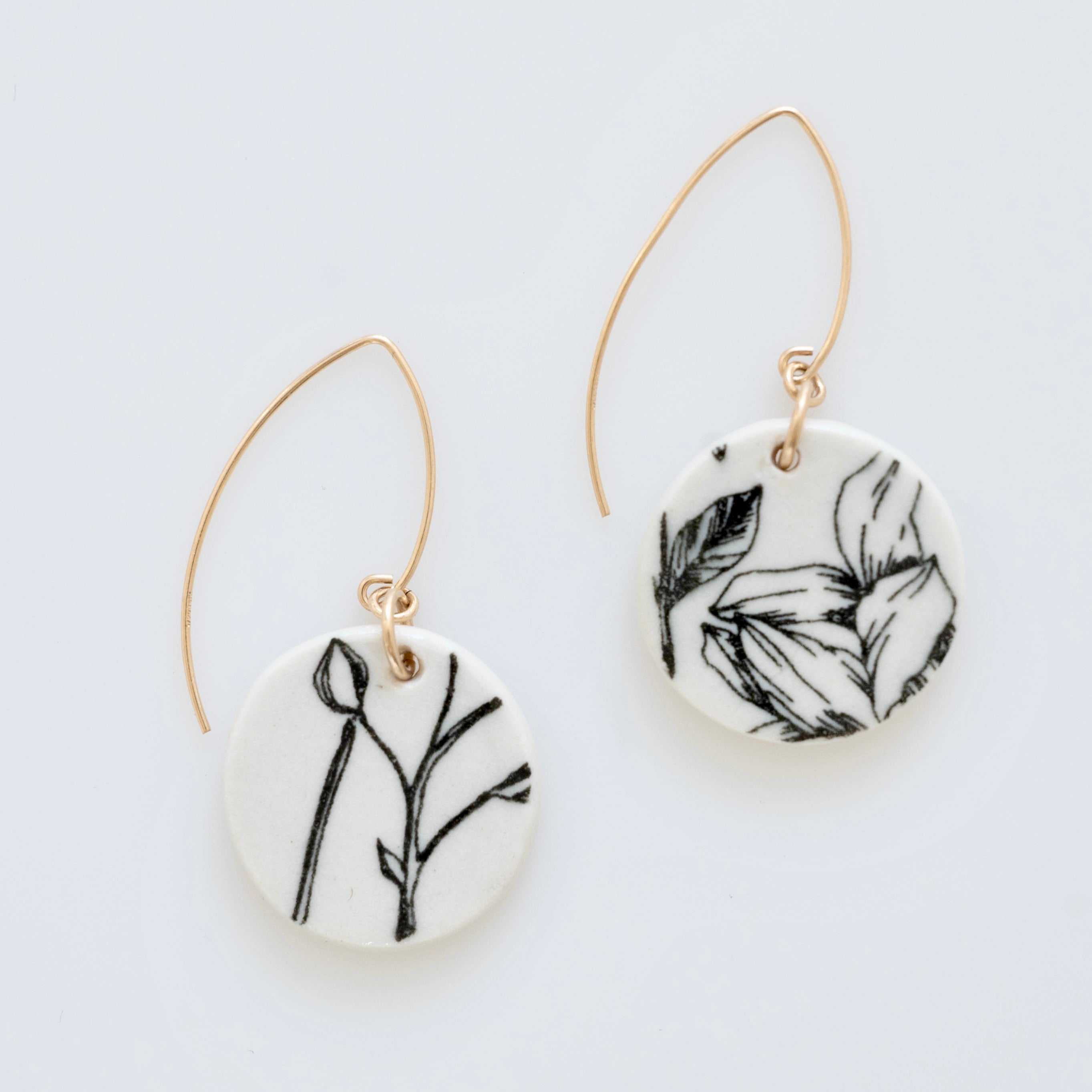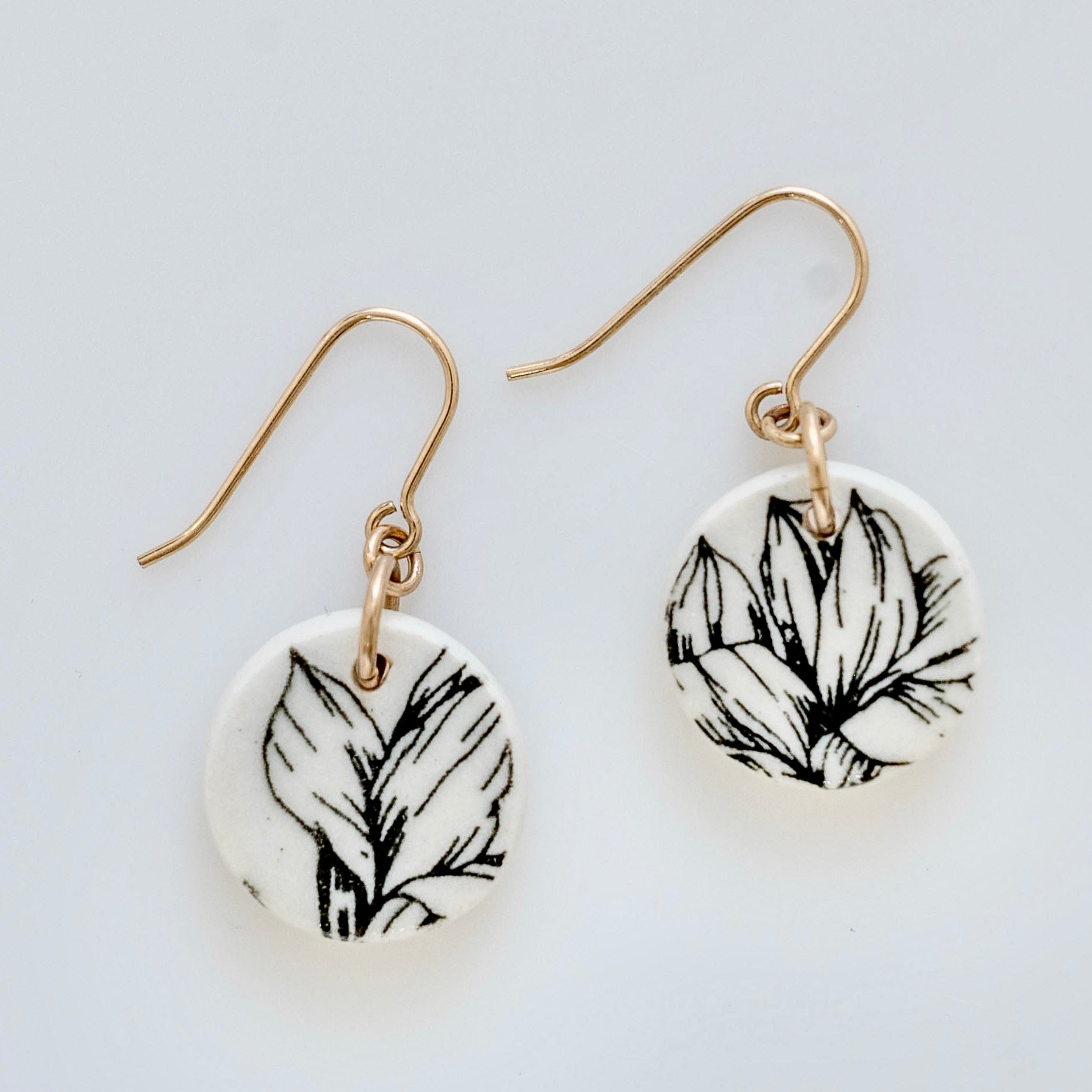 Introducing our hand painted floral earrings, Magnolia. This style features a delicate magnolia flower design in classic black & white. They are made with fine white porcelain and high quality hypoallergenic gold filled ear wires. Choose small or large size, both sizes are lightweight and comfortable to wear. They are perfect for adding elegance to any outfit. Handmade just for you, each piece is one of a kind!