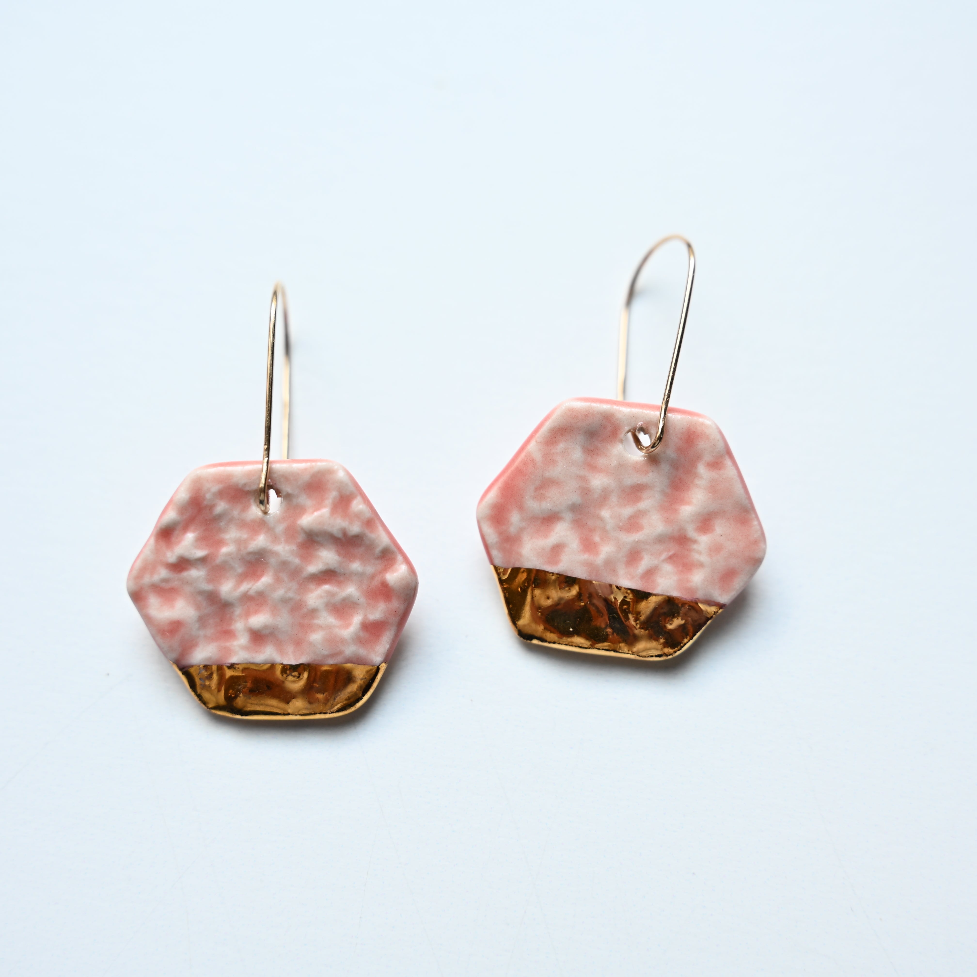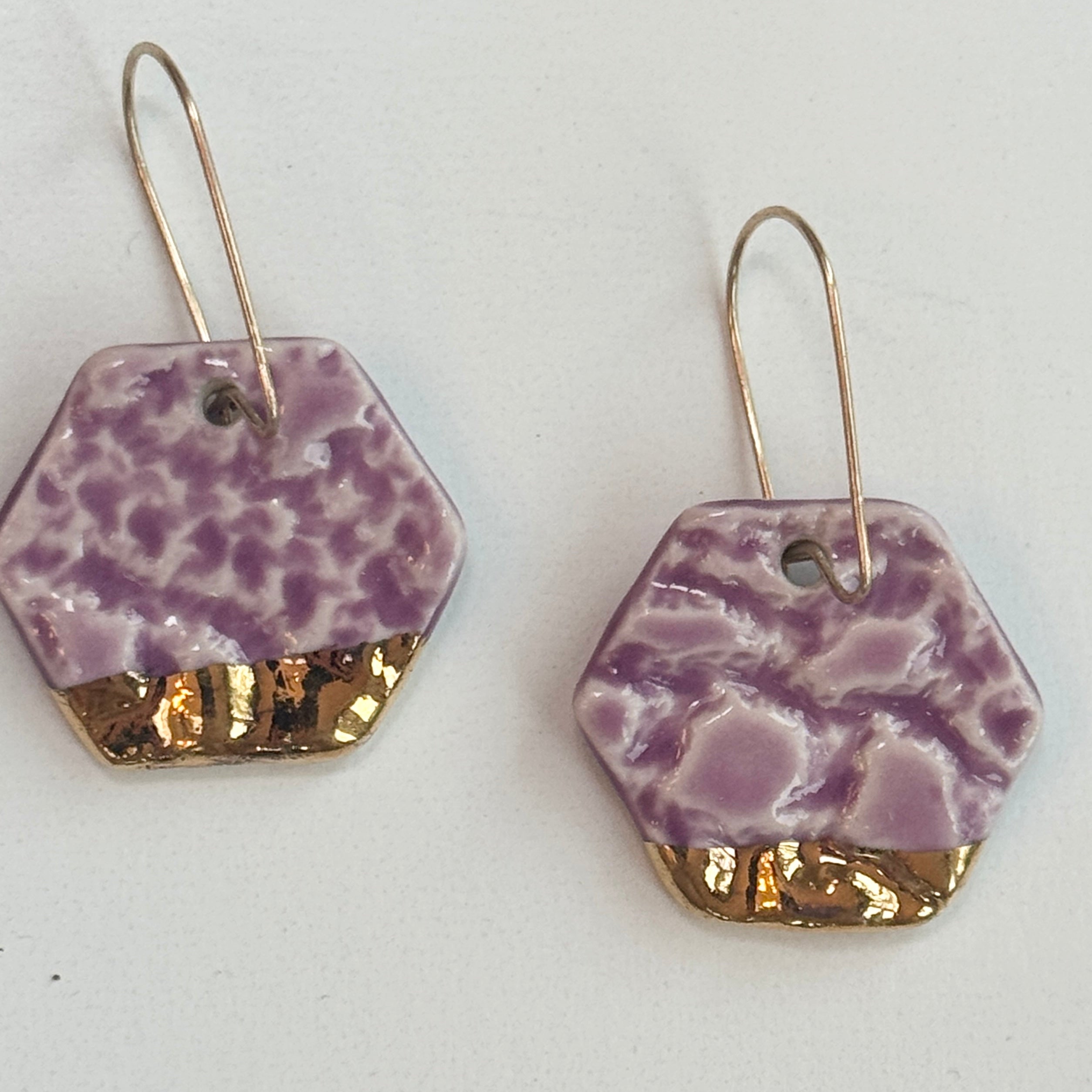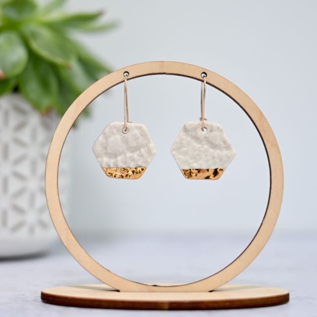 Crafted from high-quality white porcelain and embellished with 24k gold lustre, these elegant earrings will enhance your appearance with a touch of shimmer. Versatile enough for any occasion, they are lightweight and comfortable to wear. The earrings feature gold-filled ear wires that are free of nickel and lead. Each piece is meticulously hand-sculpted, glazed, and fired, resulting in a distinctive beauty. As no two pieces are exactly alike, you can expect to own a truly one-of-a-kind accessory.